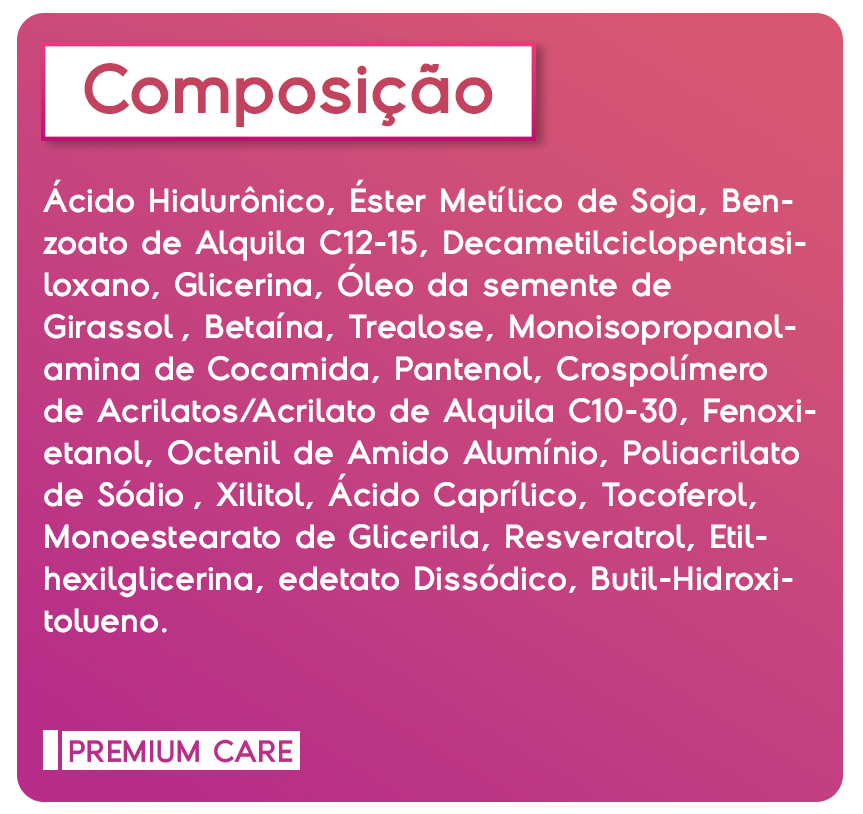 Com a presença do ácido hialurônico, conhecido pela sua alta capacidade de retenção de água, a fórmula ajuda a manter a hidratação da pele ao longo do dia. Esse ativo contribui para uma aparência mais macia e uniforme, auxiliando na redução do aspecto de ressecamento e no suporte à aparência de linhas finas e sinais do tempo, além de proporcionar uma sensação de pele mais suave e confortável.