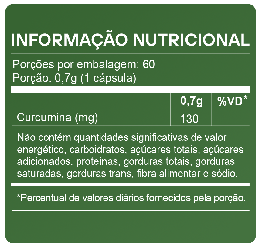 A fórmula fornece 130 mg de curcumina padronizada com 95% de curcuminoides, garantindo maior pureza e consistência do extrato. Essa padronização indica que a maior parte do conteúdo corresponde aos compostos mais relevantes da cúrcuma, oferecendo um suplemento com qualidade controlada e concentração definida.