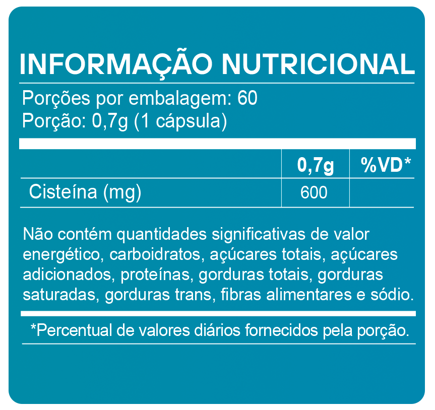Cada cápsula do NAC fornece 600 mg de L-cisteína, oferecendo uma dose concentrada em uma única unidade. Isso facilita a rotina de suplementação, reduz a necessidade de múltiplas cápsulas ao dia e torna o consumo mais prático e organizado. A dosagem padronizada também permite maior controle sobre a ingestão diária, especialmente para quem busca constância e simplicidade no uso do suplemento.