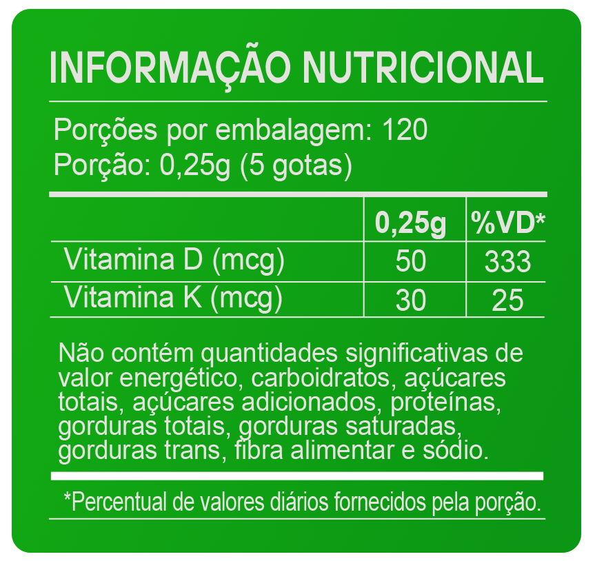 O formato em gotas facilita a ingestão e permite uma dosagem mais precisa e ajustável às necessidades individuais. Além disso, por estar em meio lipídico, a Vitamina D3 apresenta melhor aproveitamento pelo organismo, já que se trata de uma vitamina lipossolúvel, ou seja, que depende de gordura para ser absorvida de forma adequada.
