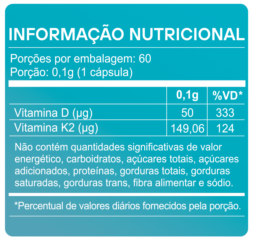 A fórmula associa Vitamina D3 e Vitamina K2 MK7 em um único suplemento, reunindo dois nutrientes que atuam de forma complementar no organismo. Enquanto a vitamina D participa do metabolismo do cálcio, a vitamina K auxilia no direcionamento adequado desse mineral para ossos e dentes, tornando a combinação uma estratégia nutricional mais completa do que o uso isolado.